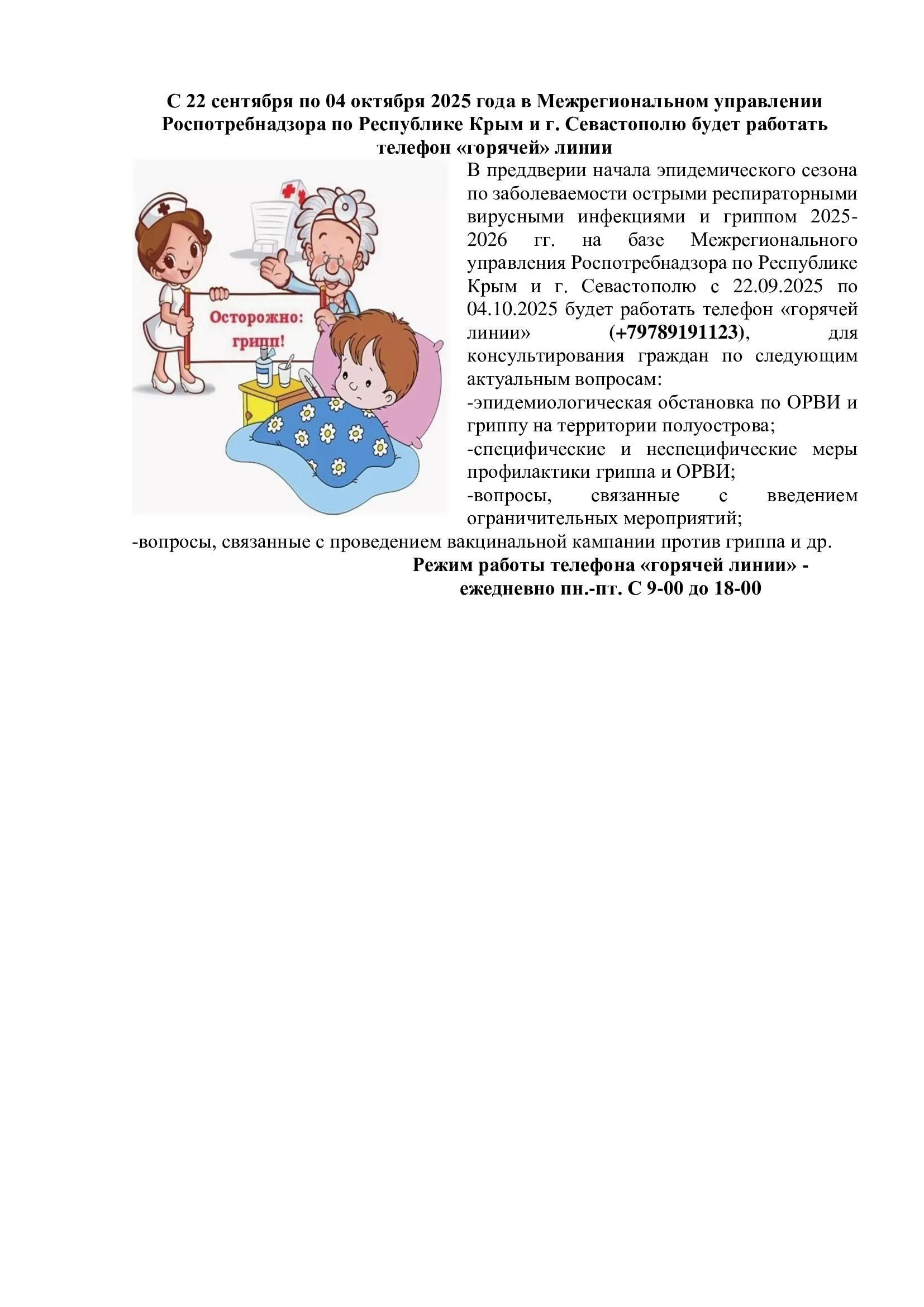 В преддверии начала эпидемического сезона по заболеваемости острыми респираторными вирусными инфекциями и гриппом 2025-2026 гг. на базе Межрегионального управления Роспотребнадзора по Республике Крым и г. Севастополю с 22.09.2025 по 04.10.2025 будет работать телефон «горячей линии» (+79789191123), для консультирования граждан по следующим актуальным вопросам: